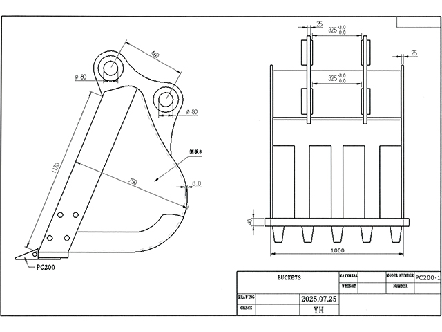 บุ้งกี๋ PC60 สำหรับรถขุด หน้ากว้าง 65 cm ยาว 76 cm รูหู 50 mm.
